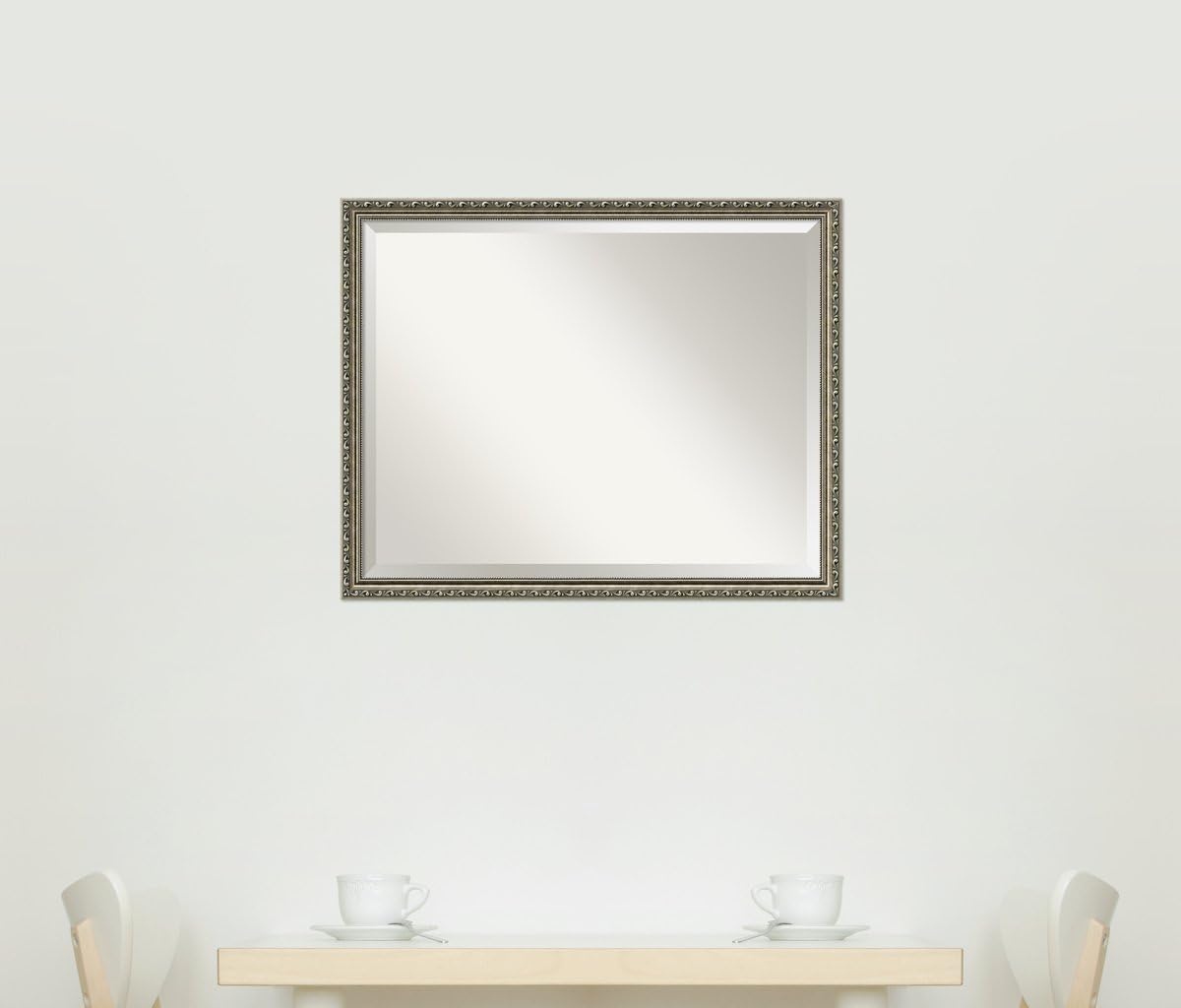 PRODUCT: Amanti Art Beveled Wood Wall Mirror; OUTER SIZE: Exactly 30.25 x 24.25 inches; FRAME: Parisian Silver; FRAME FINISH: Antique Nickel; FRAME COLOR: Silver. The Parisian Silver frame is an ornate, warm silver frame with dark pewter patina, accented by raised leaf pattern on the outer edge and fine beading on the inner edge. Give your home or office the finishing touch with this 100% real wood-framed wall mirror. Individually made using traditional custom framing techniques, it has the quality you would expect from your local frame shop. It holds its value with premium finishing that can be appreciated up close. Because of our attention to detail and focus on artistry, architects, interior designers, and homeowners alike choose this mirror to create beautiful living spaces.