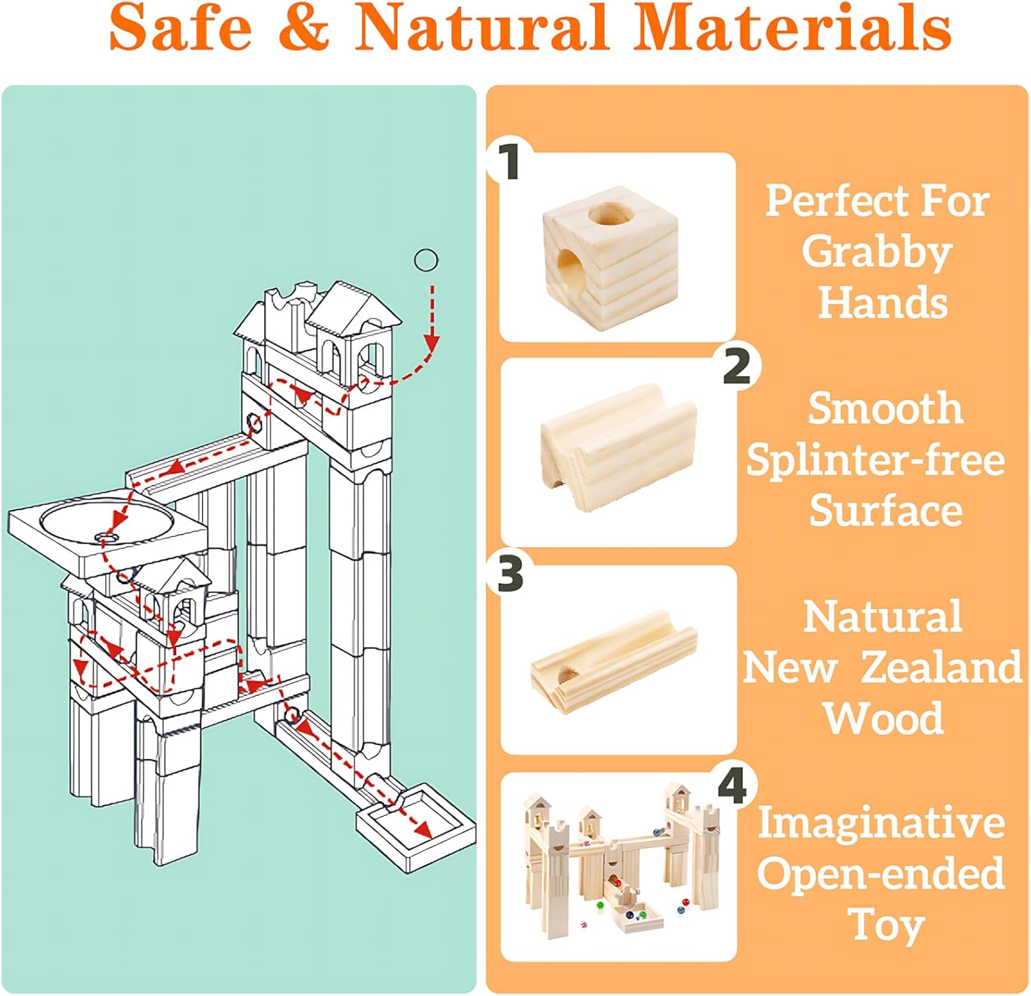| Included Components | 70 wooden blocks and tracks, 10 glass marbles and a basic builder manual book |